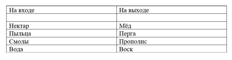 И таким образом, мы получаем простую схему – что есть «на входе» у Природного Предприятия под названием «улей», а что – «на выходе»: