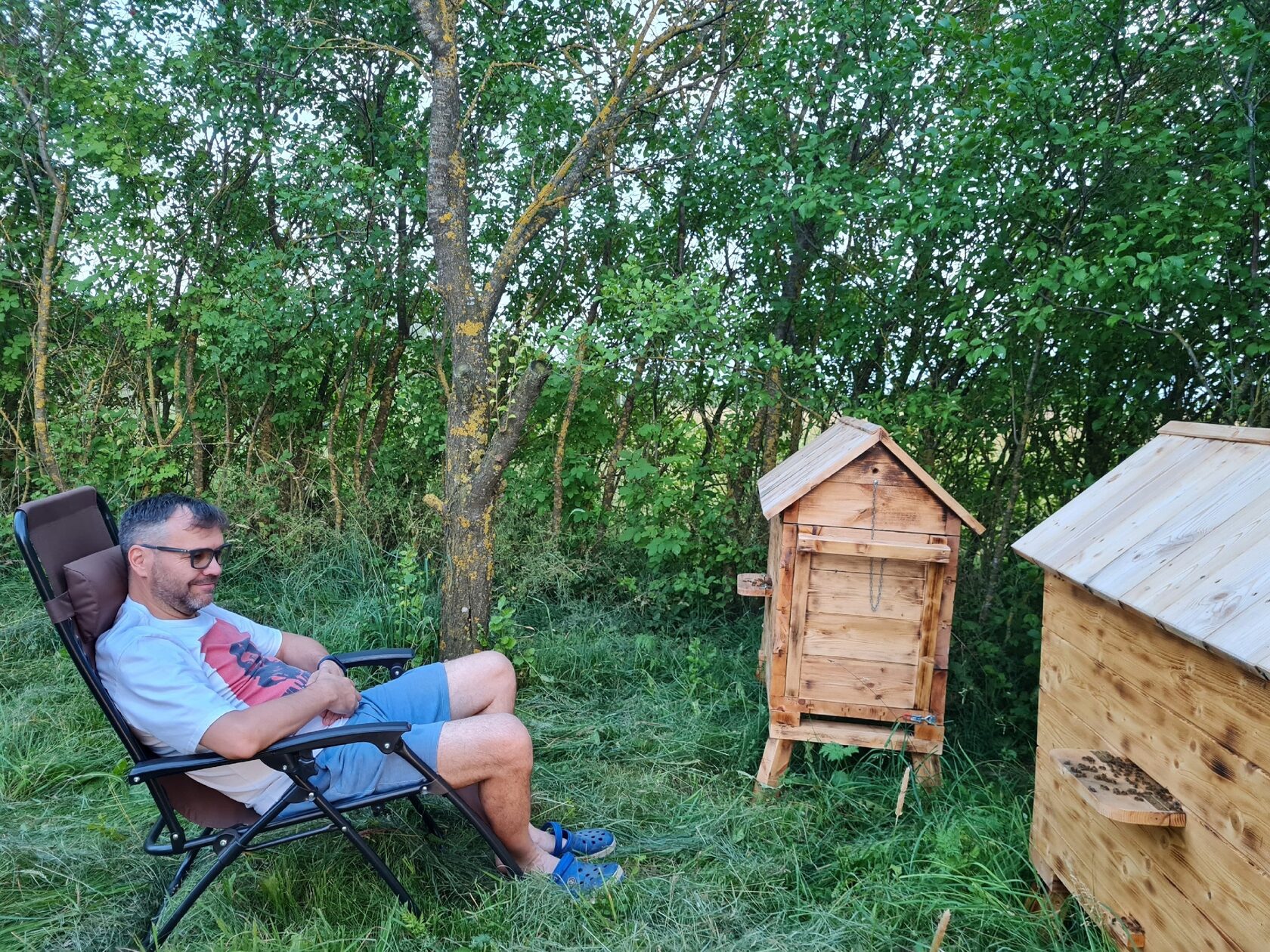 На фото наш ученик Сергей,наслаждающийся общением со своими пчёлами.